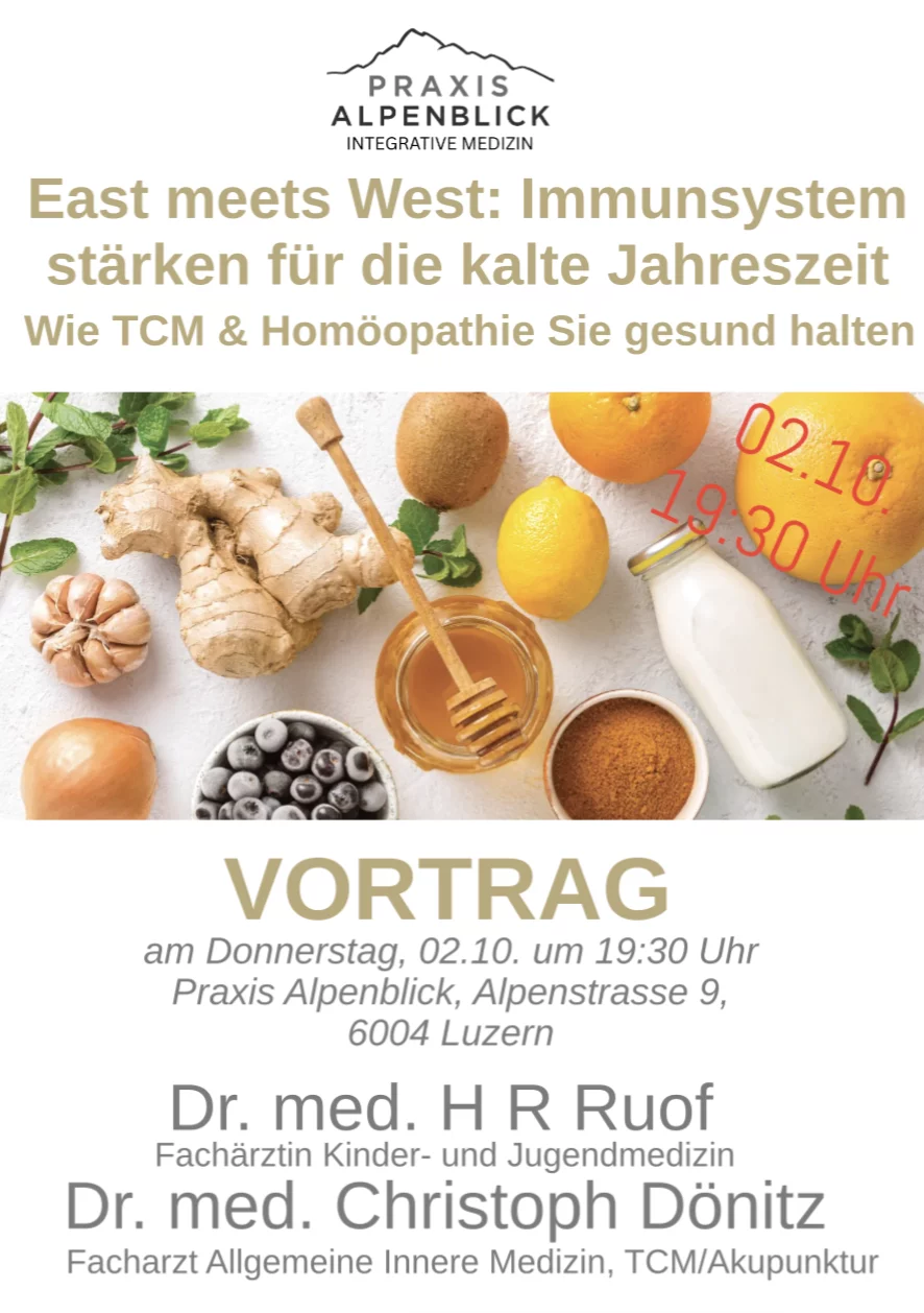 In diesem Vortrag zeigen Ihnen Dr. Helge Ruof (Kinderärztin) und Dr. Christoph Dönitz (Integrative Medizin), wie Sie Ihr Immunsystem mit einfachen Mitteln aus der Chinesischen Medizin und der Homöopathie stärken können. Ob für Kinder, Erwachsene oder die ganze Familie – Sie erhalten praktische Tipps, die sich sofort im Alltag umsetzen lassen. Sie erfahren, welche bewährten Hausmittel, Übungen und naturheilkundlichen Strategien Erkältungen vorbeugen und die Abwehrkräfte stabilisieren. So sind Sie gut gerüstet, um die kalte Jahreszeit entspannt und mit mehr Widerstandskraft zu meistern.
