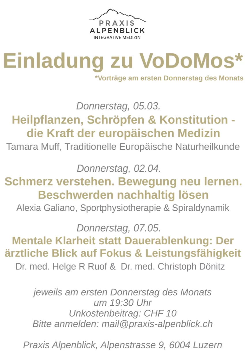 Am ersten Donnerstag jedes Monats öffnen wir die Praxis Alpenblick für Vorträge zu zentralen Fragen der Gesundheit, Leistungsfähigkeit und Selbstwirksamkeit. Unsere Themen verbinden moderne wissenschaftliche Erkenntnisse mit den bewährten Erfahrungsmedizin-Systemen Europas und Asiens.
