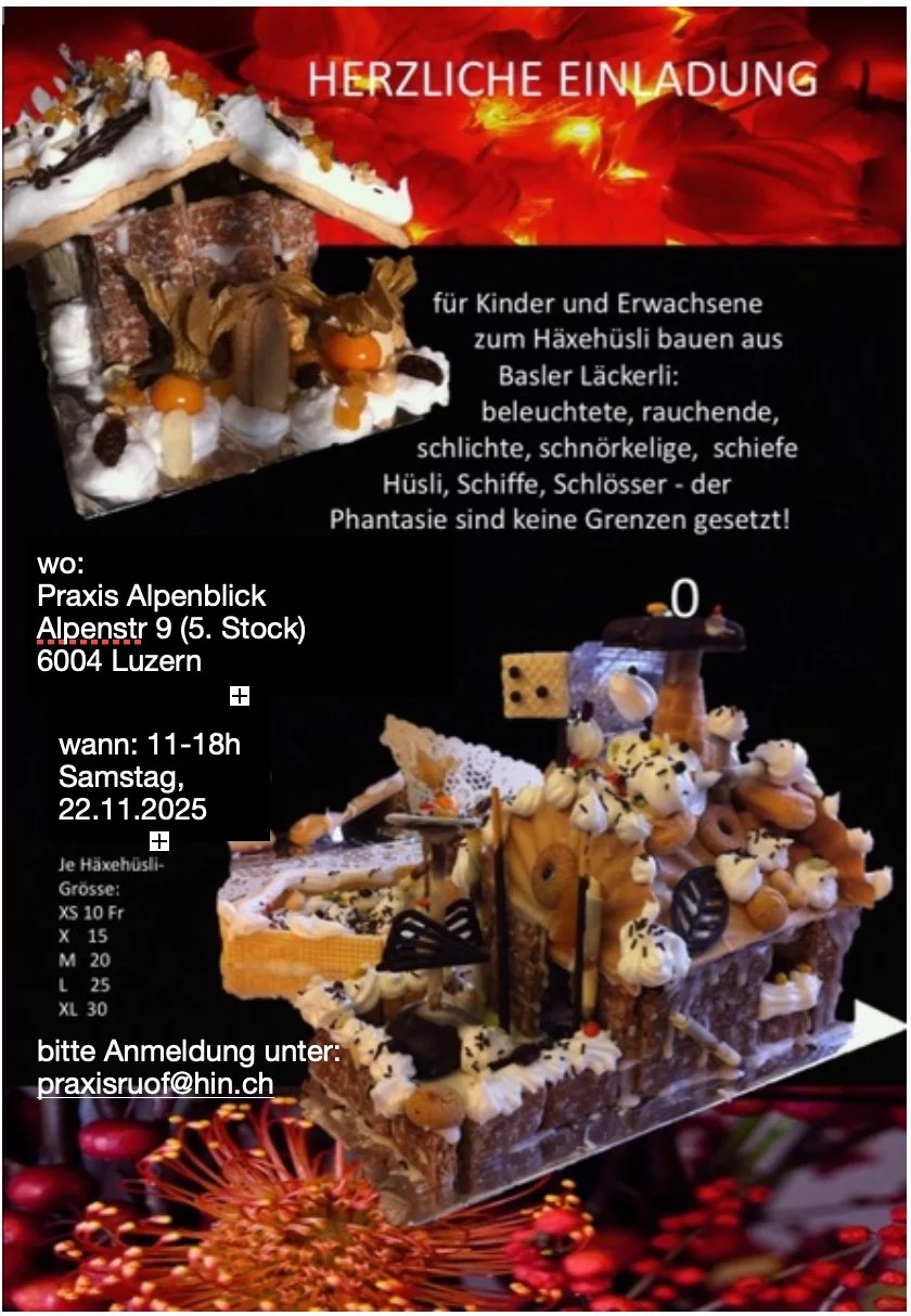 Ihr seid herzlich eingeladen. Samstag, 22.11.2025 von 11:00 - 18:00 Uhr. Bitte um Voranmeldung: praxisruof@hin.ch