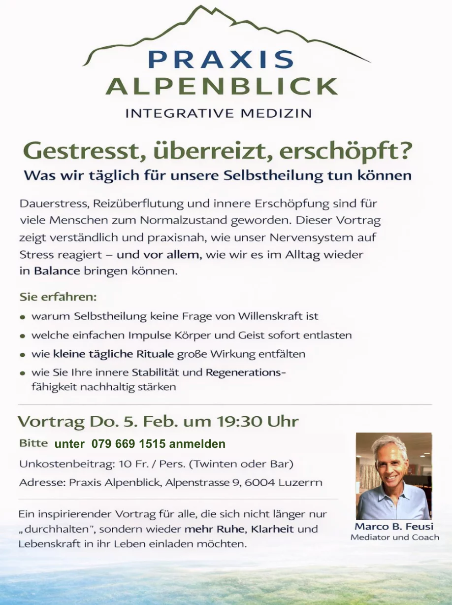 Ein inspirierender Vortrag von Marco Feusi, Mediator und Coach, für alle, die nicht länger nur durchhalten, sondern wieder mehr Ruhe, Klarheit und Lebenskraft in ihr Leben einladen möchten.